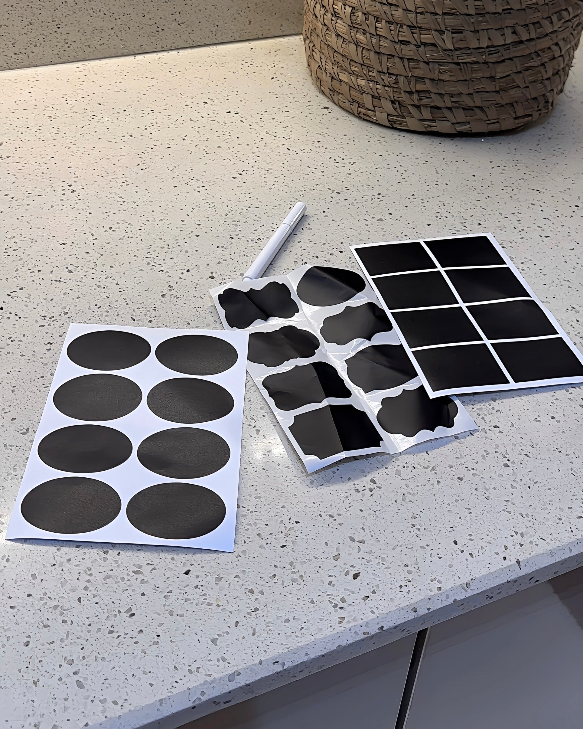 Perfect addition to pantry containers, jars, storage bins and more. These labels give a sleek, handwritten touch to your organization. Simply write with the chalk and stick to container.