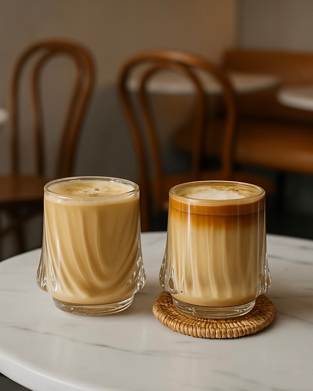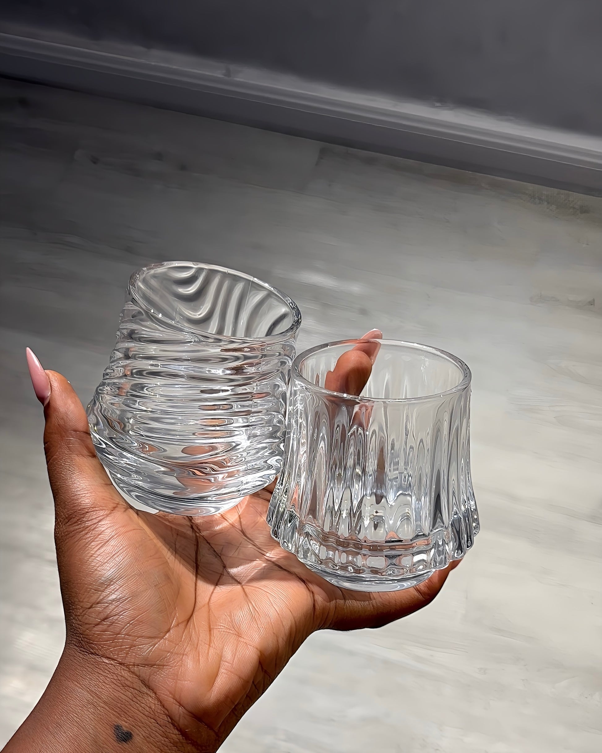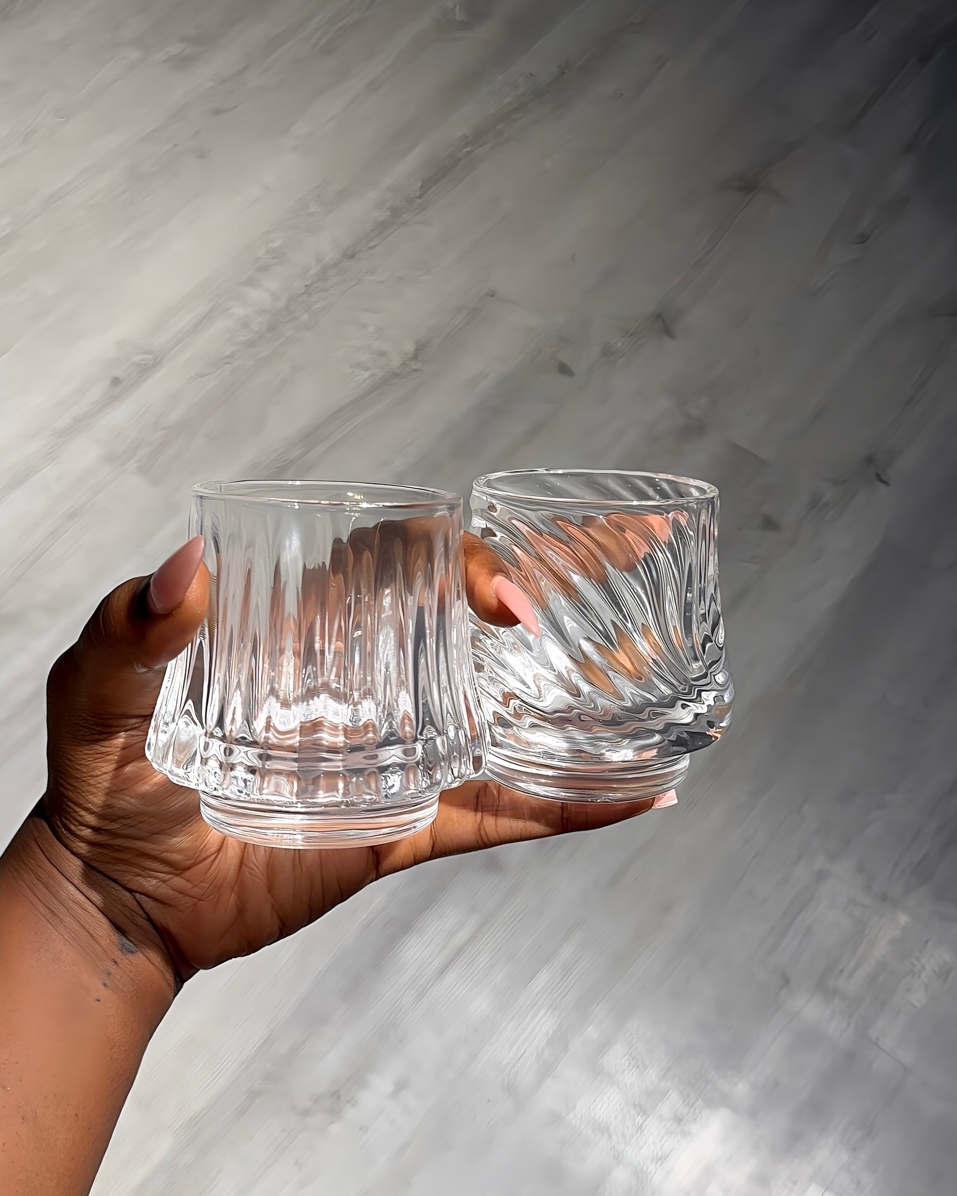 A set of two beautifully crafted glass cups with a soft ripple design that adds a subtle touch of elegance to your table.