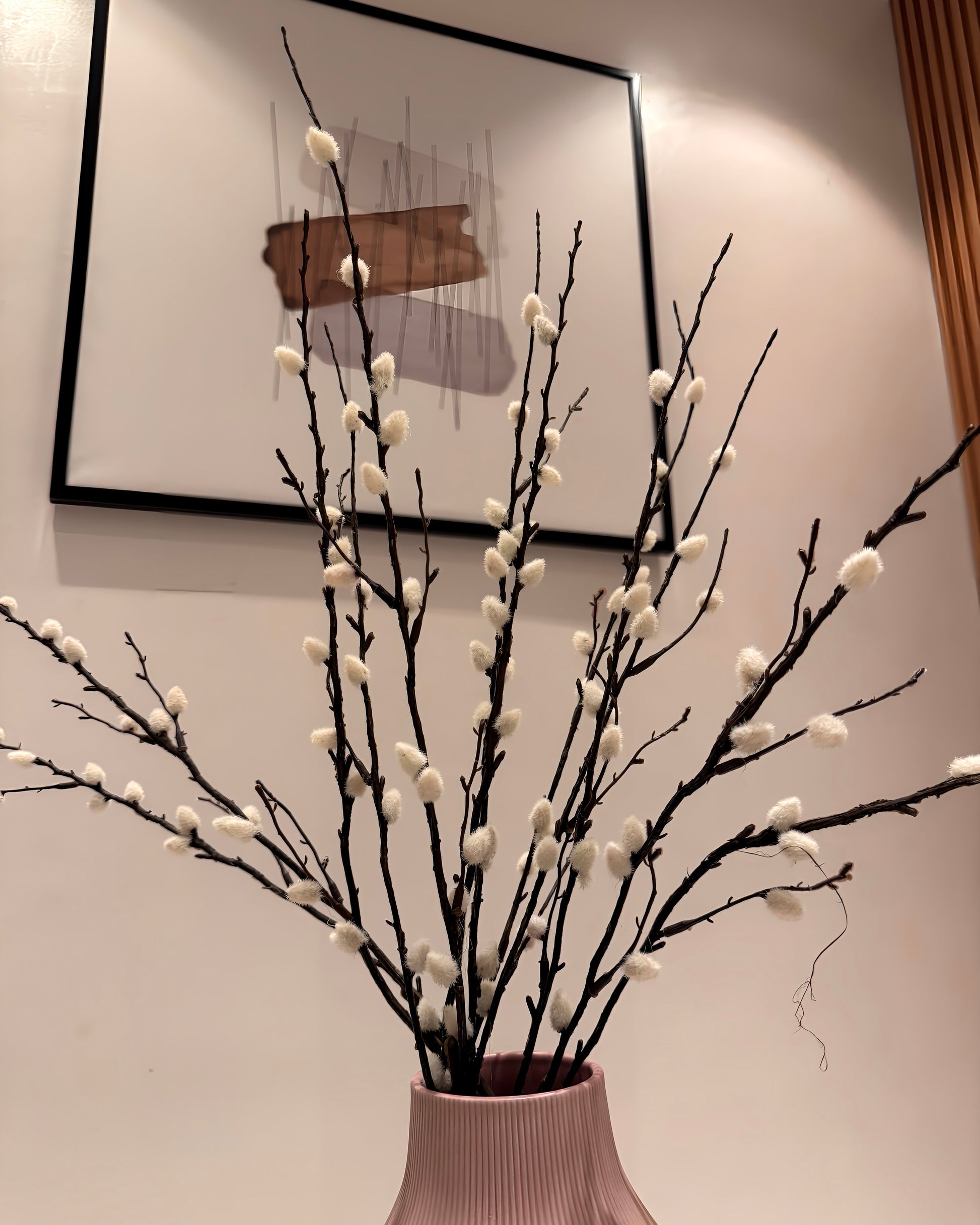 Faux brown branches tipped with soft, cotton-like buds perfect for adding texture and calm to any space. Style them alone in a vase or mix with other dried stems for an effortless, elegant display.