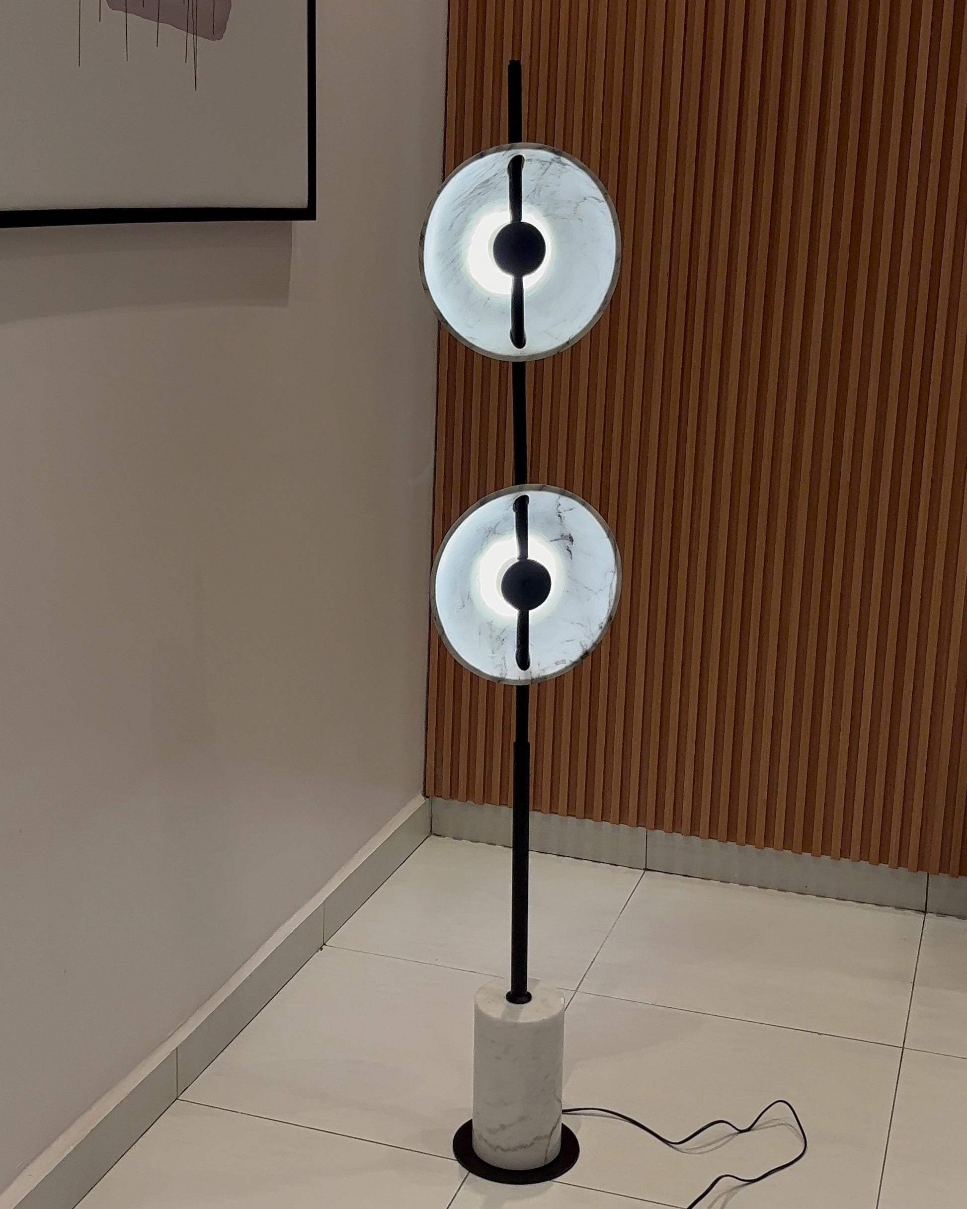 A statement in contemporary artistry, the Stellar Twin Lamp fuses modern geometry with celestial inspiration. Two luminous discs, crafted with precision and set along a sleek vertical axis, emit a subtle halo of light that seems to hover in space. Anchored by a solid marble base, the lamp exudes quiet luxury and balance, transforming light into an architectural element. With adjustable lighting, it offers tailored ambiance, from gentle warm lighting to bright white.
